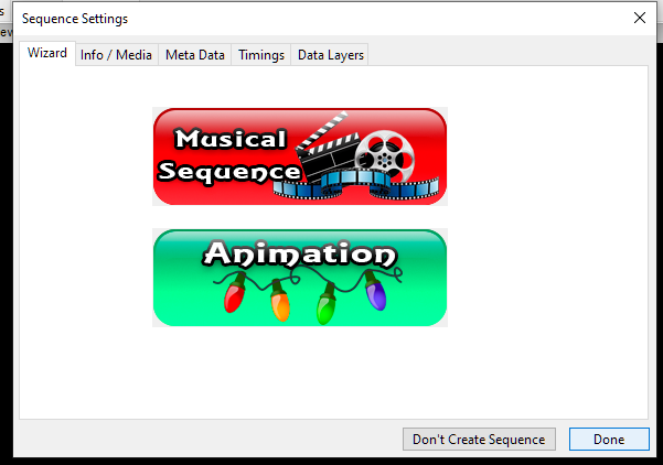 First thing you’ll get is a dialog asking if you want a “Musical Sequence” or an “Animation”. The latter is just pretty light patterns which aren’t set to music; you can totally do a show using this, use animations between sets, on holidays where there aren’t as many songs, if you have only a few lights, etc. For this, we’ll be syncing with music, so choose the “Musical Sequence” option. (Note; there are other tabs on this dialog; we’re ignoring them as you don’t need to play with them) You will be prompted to select a song; find the one you downloaded and open it.
