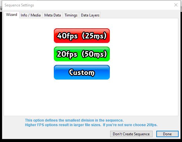 Now you’ll be asked to select either 40fps or 20fps for the framerate (the millisecond number in parenthesis are how many milliseconds each frame is allotted). Well, you can define the fps manually using the “Custom” button, but 40 and 20 are fine values; I wouldn’t use Custom unless you have a reason.