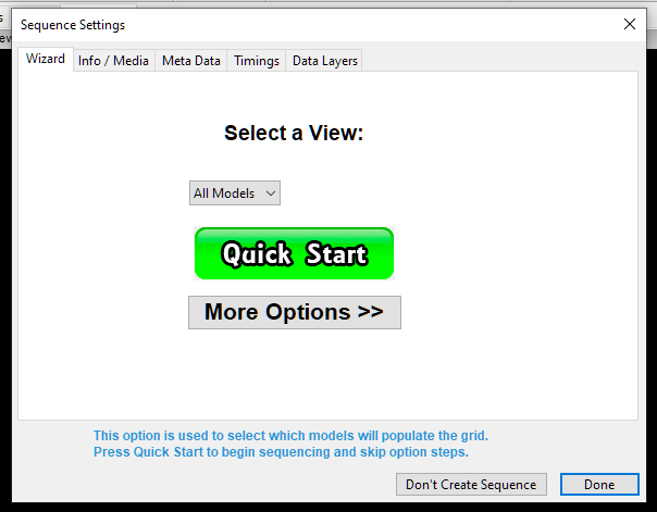 Finally, you are prompted to select which models you want included from the start, then you can either “Quick Start” or go through “More Options”. For the models, you can always manage which models are visible/controllable in the sequencer after the fact; I generally choose to start with empty because it’s easier to add a dozen or two groups/models than to remove three or four dozen models I’m not going to use individually.